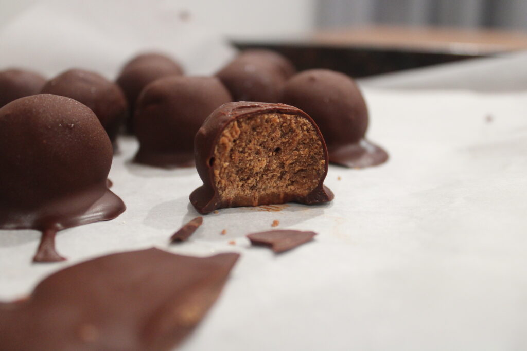 - Next start to coat the bites with the melted chocolate and place in the fridge to cool down completely before eating